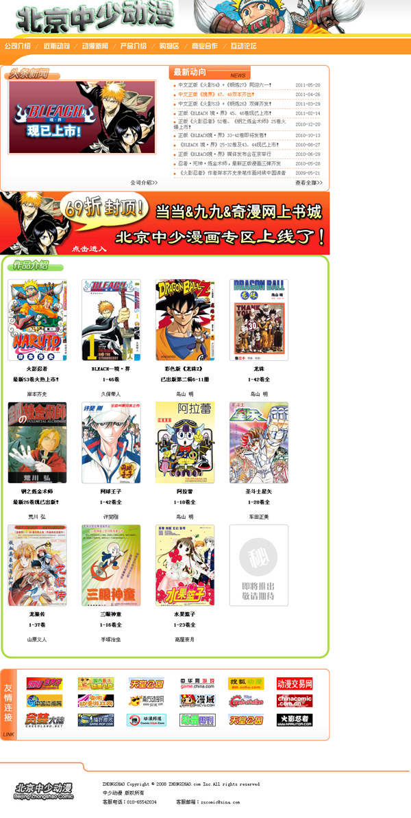 公司自創(chuàng)建以來(lái),積極與國(guó)表里各大出書社相助。如今正在運(yùn)營(yíng)的書刊有數(shù)百種,此中《火影》(首印10萬(wàn)套,上市月余即加?。?、《龍珠》(上市三年銷量近千萬(wàn)冊(cè))、《鋼之煉金術(shù)師》、《網(wǎng)球王子》、《圣斗士》(已經(jīng)再版多次)、《水果籃子》、《阿拉蕾》、《三眼神童》、《龍狼傳》以及海內(nèi)最高程度的原創(chuàng)作品“四臺(tái)甫著”等多部漫繪圖書深受讀者接待,市場(chǎng)回聲極其火爆。