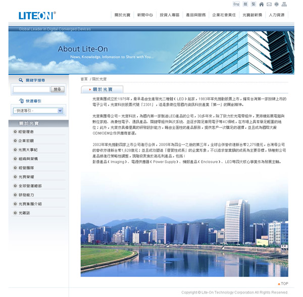 光寶集團母公司-光寶科技,為國內(nèi)第一家製造LED產(chǎn)品的公司,30多年來,除了致力於光電零組件,更持續(xù)拓展電腦與數(shù)位家庭、消費性電子、通訊產(chǎn)品、關(guān)鍵零組件與次系統(tǒng)、並漸漸跨足車用電子等4C領(lǐng)域,在市場上具有舉足輕重的職位;別的,光寶亦具備優(yōu)異的研發(fā)設(shè)計本領(lǐng),藉由全面性的產(chǎn)品服務(wù),提供客戶一次購足的選擇,並且成為國際大廠ODM/OEM相助供應(yīng)商首選。