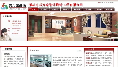 網站建設公司,做網站優(yōu)化關鍵詞排名SEO,營銷型,手機網站建設,響應式,品牌型,電商/門戶,外貿型網站建設. 深圳市興萬家裝飾工程設計有限公司從1999年工商局注冊成立, 2006年度被評為《中國裝飾行業(yè)十大影響力品牌》主要從事別墅,住宅,辦公,商業(yè),酒店,娛樂,學校,醫(yī)院等場所的設計與施工...