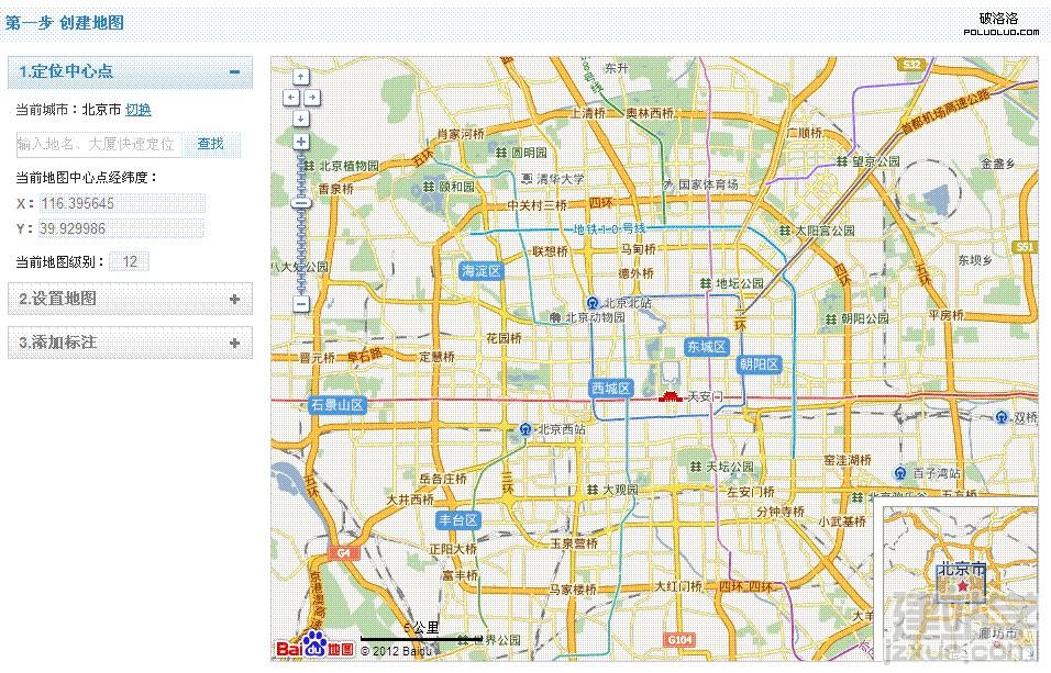 1.定位中心點(diǎn),默認(rèn)為北京,點(diǎn)擊切換,輸入公司的具體所在城市和具體地址。這個(gè)時(shí)候,地圖會(huì)切換到該地點(diǎn)范圍內(nèi)。