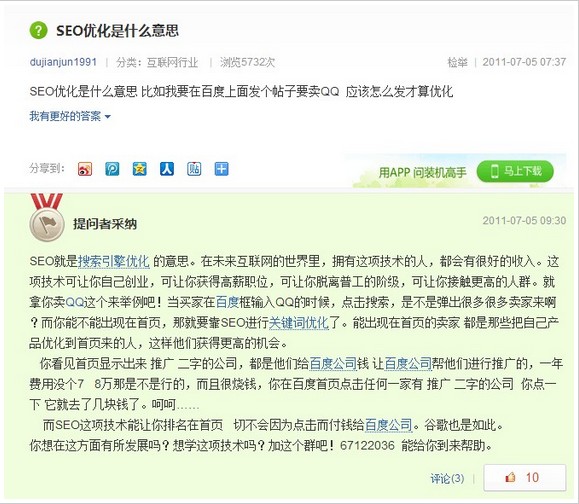4. 看到這些我們想的不是說(shuō)百度是不是不公平,是不是只許州官放火,不許百姓點(diǎn)燈的情況,大家要是這樣想就錯(cuò)了!大家看看為什么百度知道會(huì)這樣調(diào)整!意義在那里?我們可以借鑒什么?為什么我們做seo做搜索引擎優(yōu)化,不在搜索引擎中去了解他的東西 他的變化 他的發(fā)展,以及他的創(chuàng)新和改變,孫子兵法沒有教我們 知己知彼嗎?多的不說(shuō)了!說(shuō)多了不招人待見!有其他見解可以私下找我!一起探討!