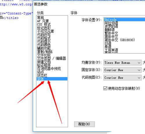 點(diǎn)擊“首選參數(shù)”之后,就會(huì)彈出一個(gè)小窗口,選擇其中的”字體“選項(xiàng)。